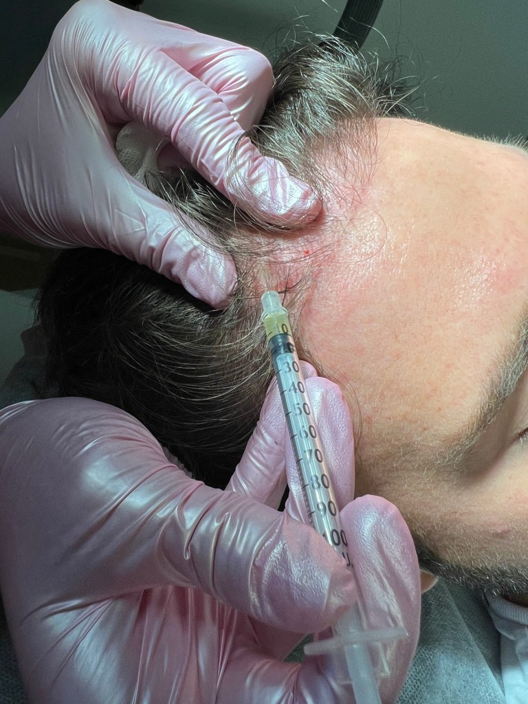 Anschließend wird das Plasma in die Kopfhaut des Patienten injiziert, wo es seine Wirkung entfaltet. Die injizierten Thrombozyten setzen dann Wachstumsfaktoren frei, die das Haarwachstum anregen und die Kopfhaut stärken.